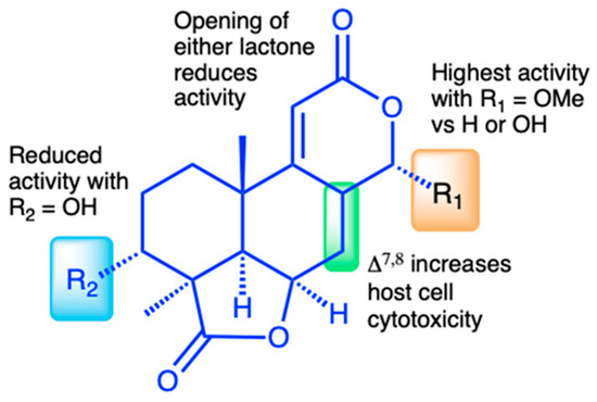 The discovery of a suite of 14 structurally related norditerpene lactone derivatives with widely different anti-parasitic activities provided an opportunity to compare the structure–activity relationships (SARs) related to both anti-parasitic activity and host cell cytotoxicity (Figure 7). For this series, the primary features of the most active compounds include a C-13 O-methyl ether, lack of a hydroxy group at C-3, and intact lactone rings. Although the type C diene congener, oidiolactone B, was the most potent inhibitor of C. parvum and T. gondii, it was also more toxic towards actively dividing host cells, while the type B epoxide derivative, oidiolactone A, had a higher therapeutic index. This initial set of SAR data provides a useful set of guidelines for further testing and discovery of additional related natural norditerpene dilactones, as well as synthetic derivatives.