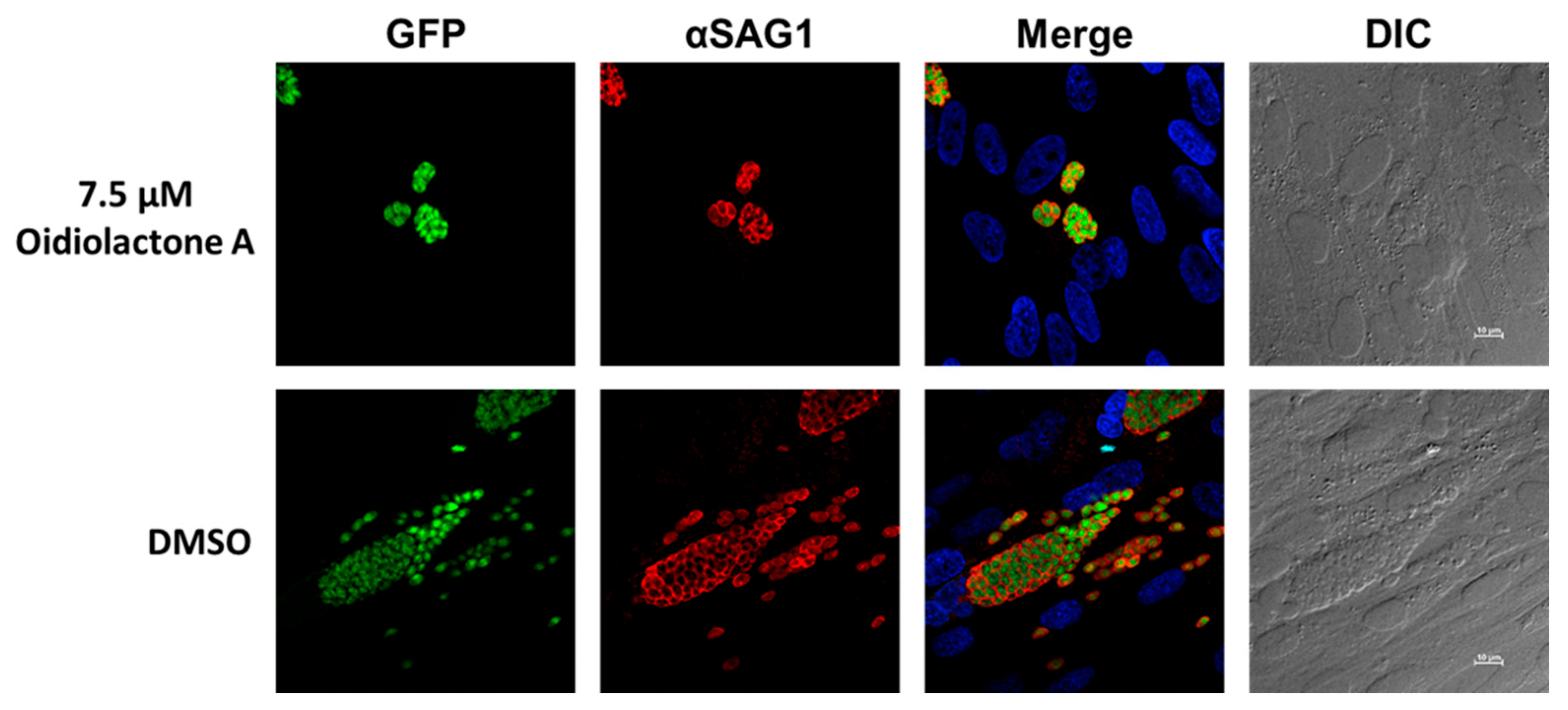 3.9. Oidiolactone A Does Not Inhibit Excystation or Prevent Invasion of C. parvum Sporozoites into Host Cells