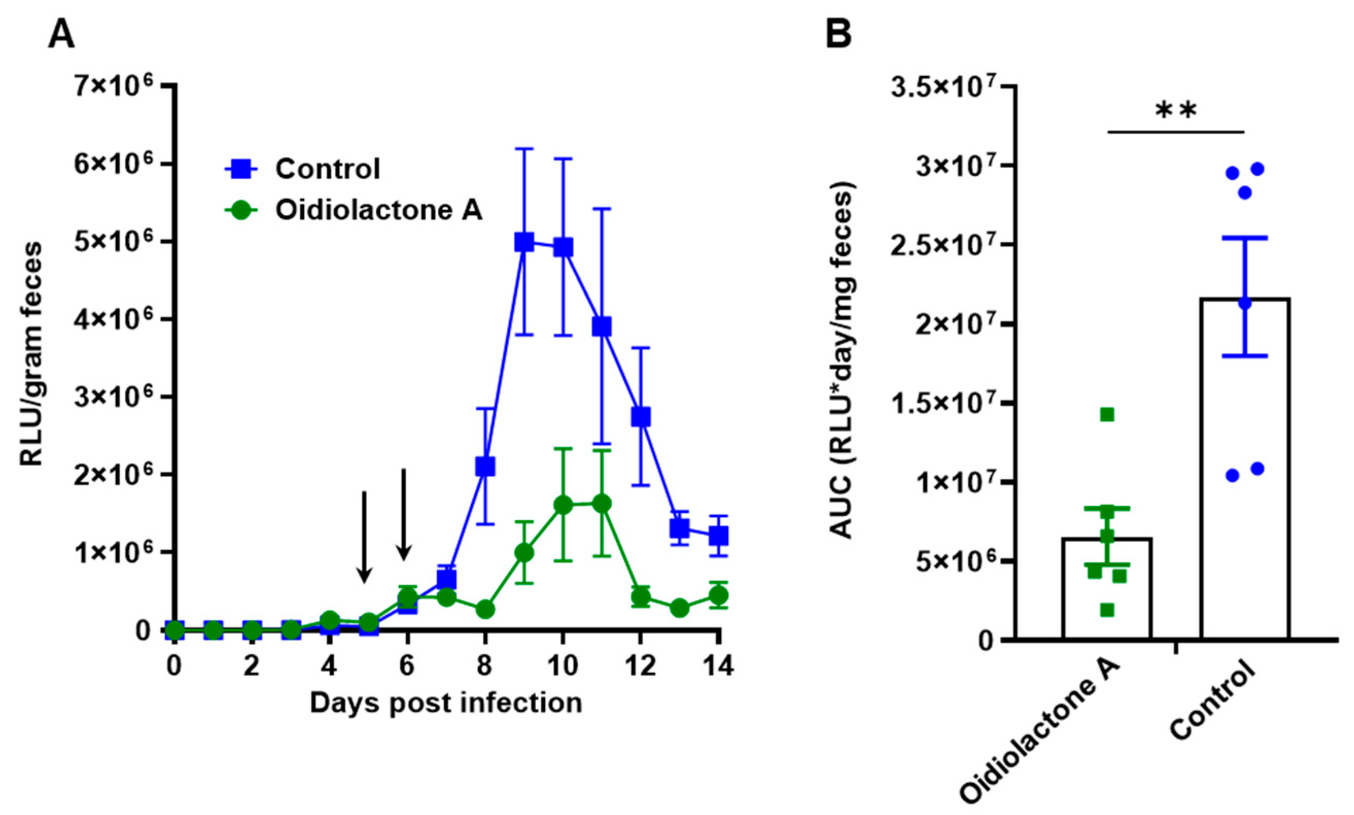 3.10. Oidiolactone A Reduces Infection in IFNγ−/− Mice Infected with Cp-NLuc