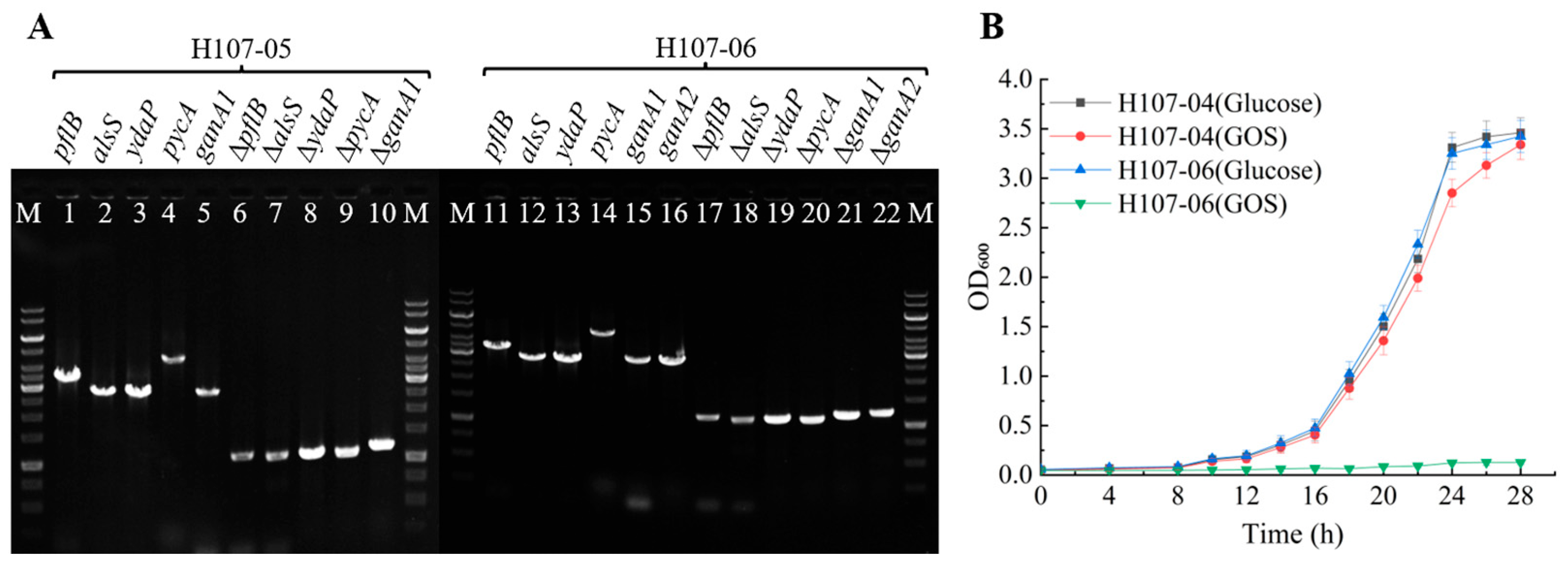 3.2. Selection of Lactose and GOS Non-Metabolizing Mutants