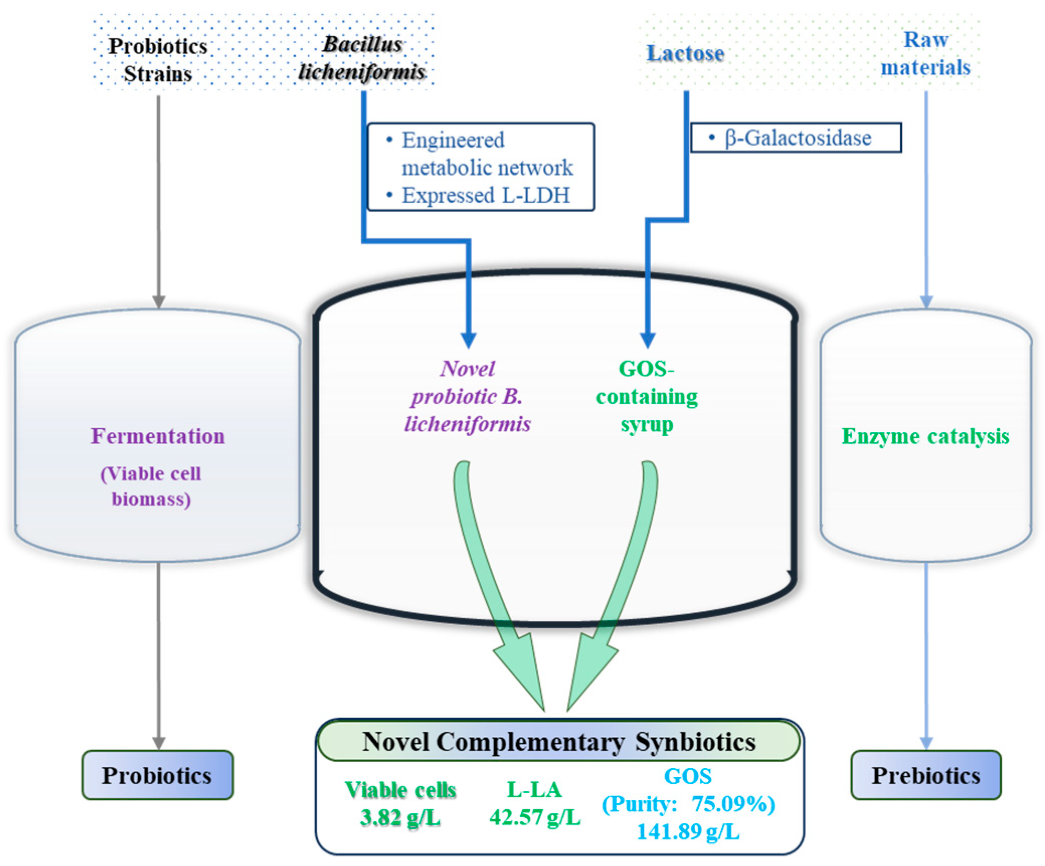 Zhao J, Mu T, Niu D, Ding Z, Mchunu NP, Zhang M, Singh S, Wang Z. Metabolic Engineering of Bacillus licheniformis for High-Yield L-Lactic Acid and Galactooligosaccharide Retention in Complementary Synbiotics Production. Microorganisms. 2025; 13(11):2530. https://doi.org/10.3390/microorganisms13112530