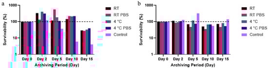 Survivability of B. globigii collected using the LCP-WWC with or without the addition of 10% PBS, archived at different temperatures for 15 days. (a) Vegetative cell and (b) spore survivability expressed as a percentage of the CFU counts from the corresponding Day 0 samples, indicated by the dotted line. RT denotes room temperature of 21 to 23 °C.