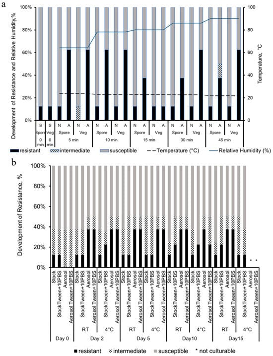 The percentage of antibiotic susceptibility in (a) B. globigii vegetative cells and spore stock suspensions (S), nebulized liquids (N), and aerosols (A) after 5, 10, 15, 30, and 45 min aerosolization and collection by the WWC, along with the RH (left axis) and temperature (right axis) inside the chamber, during the tests. The percentage of antibiotic susceptibility in (b) vegetative cell and (c) spore samples collected with the LCP-WWC and archived for 15 days at room temperature or 4 °C, with or without PBS.