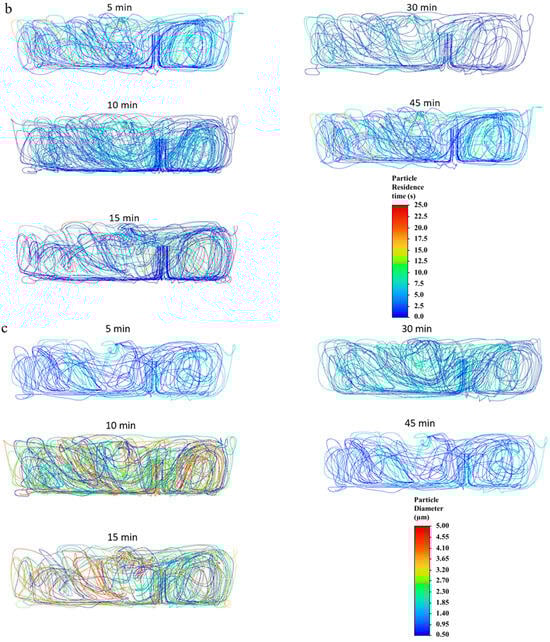 Changes in (a) air velocity streamlines, (b) particle residence time, and (c) particle diameter at 5, 10, 15, 30, and 45 min of the steady state simulations in the environmental chamber.