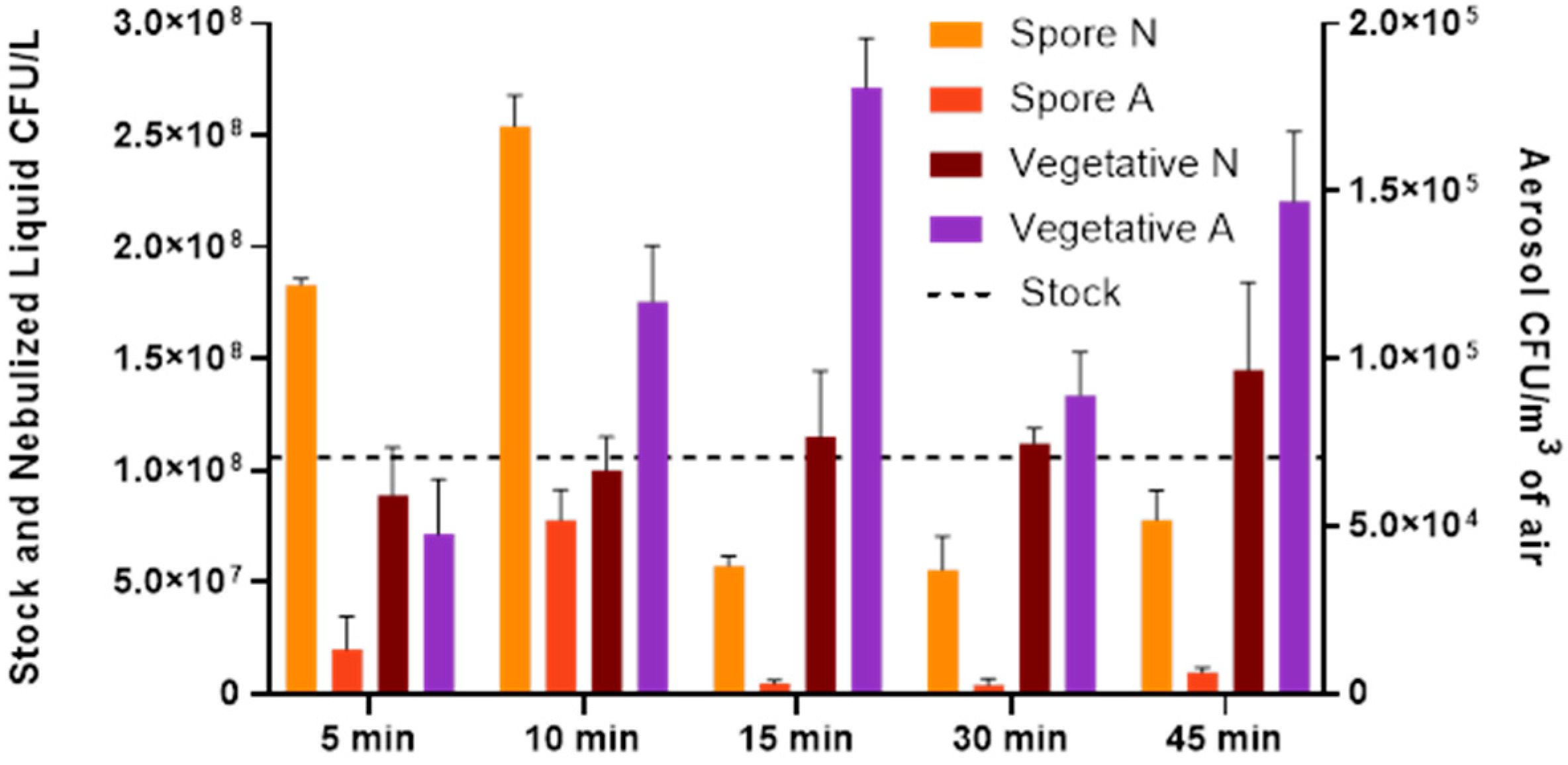 Smith, B.L.; Zhang, M.; Kumar, S.; King, M.D. Aerosolization Affects Bacillus globigii Vegetative Cell and Spore Behaviors. Microorganisms 2025, 13, 2532. https://doi.org/10.3390/microorganisms13112532