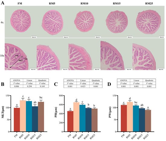 Effects of replacing fish meal with rapeseed meal on the intestinal histological structure of largemouth bass. (A) Intestinal histological structure by H&E (scale bars: 400 and 200 μm). (B) MLT: muscle layer thickness. (C) PH: plica height. (D) PW: plica width. The data are all expressed as mean ± SEM (n = 3). Significant differences among all the data were represented by different letters in the columns (p < 0.05). A linear or quadratic trend analysis described the response of replacing fish meal with rapeseed meal using orthogonal polynomial contrasts.