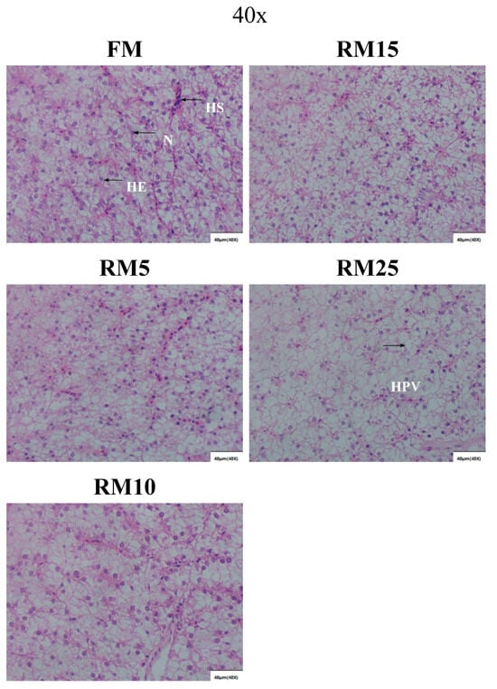 The results of liver tissue sections showed that with the increase of rapeseed meal replacement level, the number of hepatocytes, nuclei, and nucleus sinusoids gradually decreased, and vacuolization appeared in the tissues, especially in the RM25 group (Figure 2). Liver damage may interfere with the metabolic capacity of largemouth bass, thereby inducing a series of negative effects caused by nutrient absorption issues.