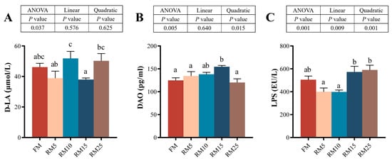 The results showed that the contents of D-lactic acid (D-LA), diamine oxidase (DAO), and lipopolysaccharide (LPS) were significantly influenced by the RM replacing levels (p < 0.05; Figure 3). D-LA and LPS levels in the RM25 group were higher than those in the FM group. Additionally, the DAO level in the RM15 group also showed a significantly high value (p < 0.05). The relationship between RM replacing levels and LPS was better described by a linear model or a quadratic model. In contrast, the relationship between DAO and RM replacing levels only shows a significant quadratic model.