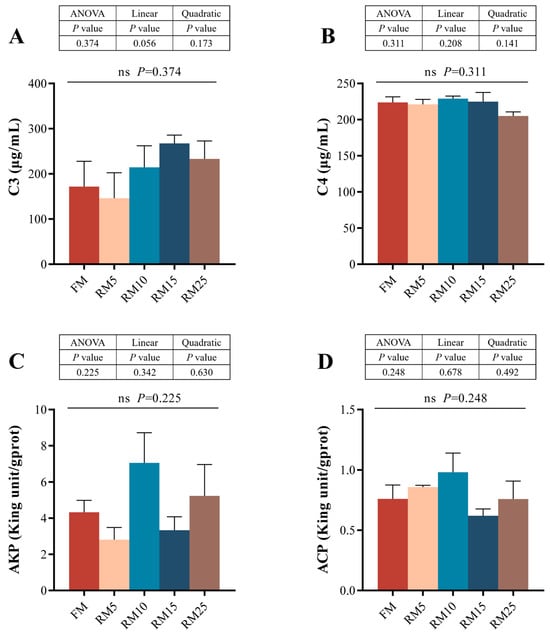 Effects of replacing fish meal with rapeseed meal on intestinal immune factors in largemouth bass. (A) C3: complement component 3. (B) C4: complement component 4. (C) ACP: acid phosphatase. (D) AKP: alkaline phosphatase. The data are all expressed as mean ± SEM (n = 3). and ns means that there is no significant difference. A linear or quadratic trend analysis described the response of replacing fish meal with rapeseed meal using orthogonal polynomial contrasts.