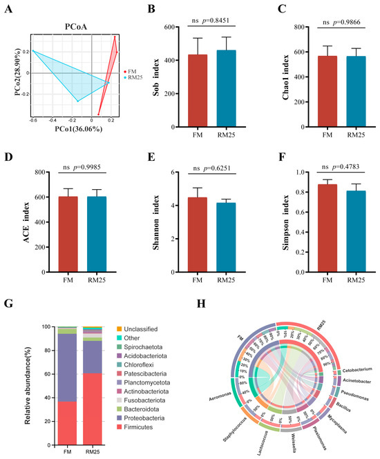 As the results showed in Figure 5, the differences and distances between the FM and RM25 groups were reflected by PcoA. The contribution rates of Pco1 and Pco2 were 36.6% and 28.90%, respectively (Figure 5A). Although there were no significant differences in the alpha diversity indices (Sob, Chao1, ACE, Shannon, and Simpson) between groups (p > 0.05). The Shannon index and Simpson index in the RM25 group were lower than those in the FM group, although there is no statistical difference (Figure 5B–F).