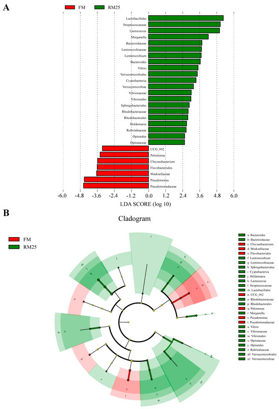 LEfse analysis revealed significant differences (LDA > 2, p < 0.05) in the intestinal microbiota between FM and RM25 (Figure 6). The results showed that the relative abundances of Lactobacillales, Streptococcaceae, Lactococcus and Morganella in the RM25 group were significantly increased compared with those in the FM group. However, the relative abundances of Pseudomonadaceae, Weeksellaceae, Flavobacteriales and Pseudomonas were significantly decreased in the RM25 group compared with those in the FM group.