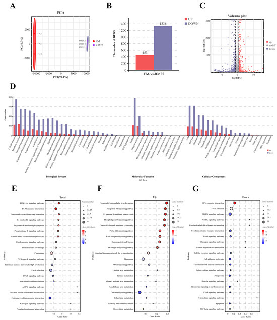 Analysis of the intestinal transcriptome of largemouth bass in the FM and RM25 groups. (A) Principal component analysis between the FM and RM25 groups. (B) Column chart of the number of DEGs. Up-regulated differentially expressed genes are represented by red color, and down-regulated differentially expressed genes are represented by blue color. (C) Volcano plot of the distribution of DEGS. (D) The enriched Gene Ontology (GO) terms of the DEGs. The X-axis corresponds to the GO terms; the Y-axis indicates the number of DEGs for each GO term. (E) The top 20 enriched Kyoto Encyclopedia of Genes and Genome (KEGG) pathways of all DEGs. (F) The top 20 enriched Kyoto Encyclopedia of Genes and Genome (KEGG) pathways of upregulated DEGs. (G) The top 20 enriched Kyoto Encyclopedia of Genes and Genome (KEGG) pathways of down-regulated DEGs.
