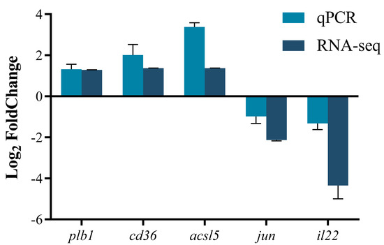 In order to verify the reliability of the transcriptome data, the qPCR technique was used to validate the expression levels of several randomly selected genes. The results are shown in Figure 8. The upregulation levels of the cd36 and acsl5 genes in qPCR were higher than those in RNA-seq, while the downregulation levels of the jun and il22 genes in qPCR were lower than those in RNA-seq. The expression of Plb1 was comparable between the two methods, and the overall change trend was consistent with the results of RNA-seq.