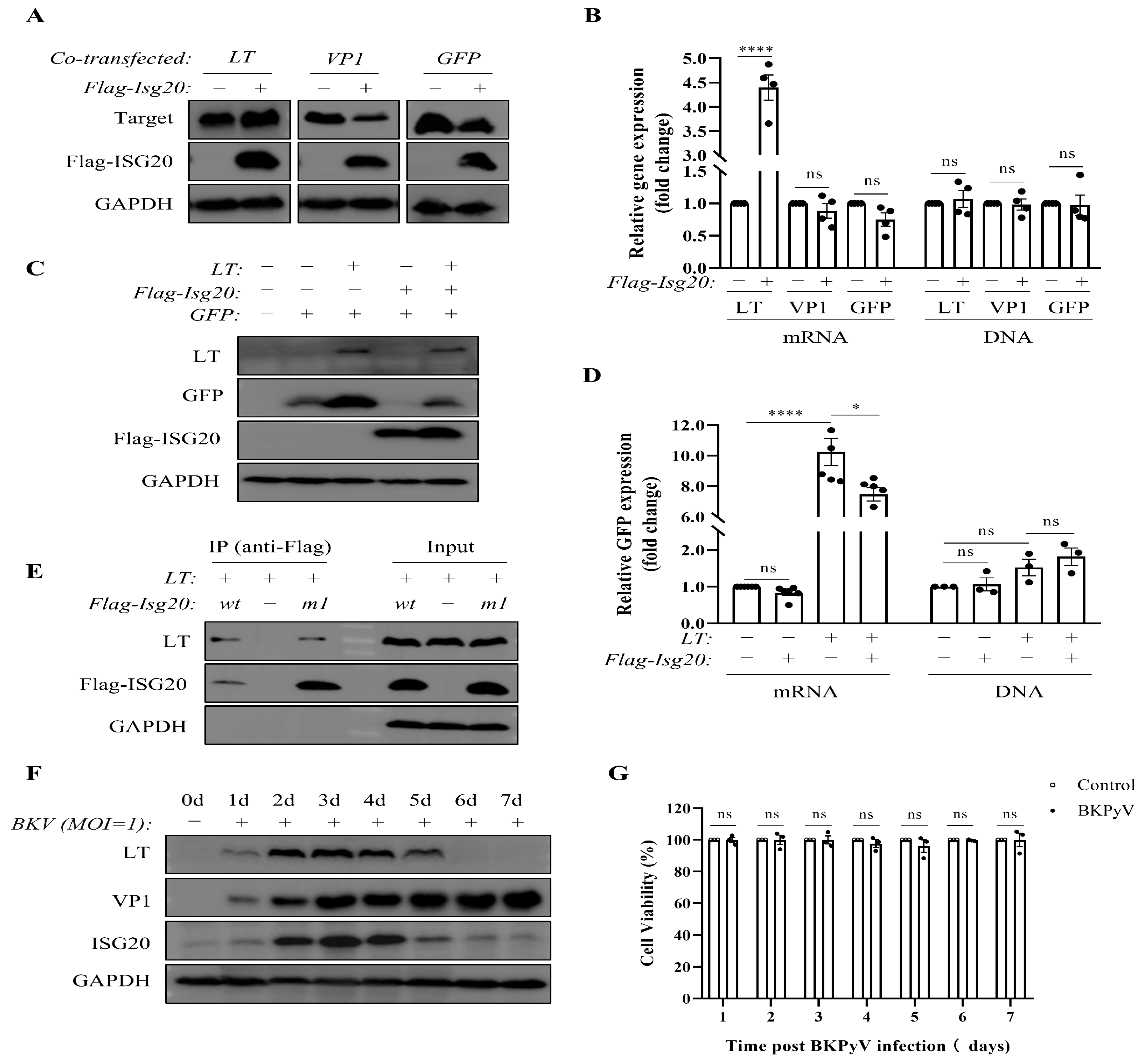 Hou, Y.; Hu, C.; Shi, Y.; Zhou, X.; Zhu, T.; Wu, N. ISG20 Restricts BK Polyomavirus Infection and Engages in Reciprocal Regulation with Viral Large T Antigen. Microorganisms 2025, 13, 2540. https://doi.org/10.3390/microorganisms13112540