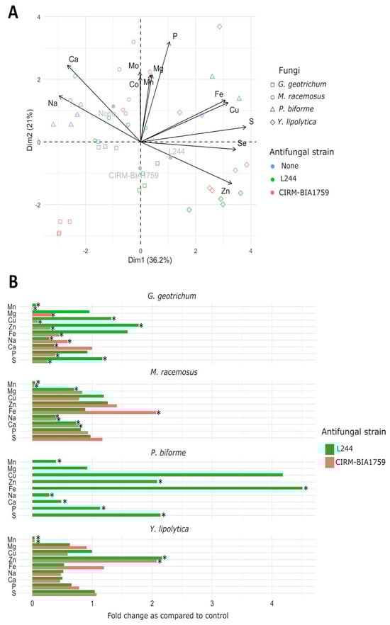 PCA (A) and trace element uptake fold change as compared to control (B), showing profile of G. geotrichum, M. racemosus, P. biforme and Y. lipolytica in whey from yogurts produced either only with MY800 (None) or with addition of either the antifungal L. plantarum L244 (L244) or L. rhamnosus CIRM-BIA1759 (CIRM-BIA1759) strains after 2 weeks of storage at 10 °C (four replicates/condition). An asterisk indicates a statistically significant difference between control whey and antifungal whey concentrations according to a Student t-test (p < 0.05).