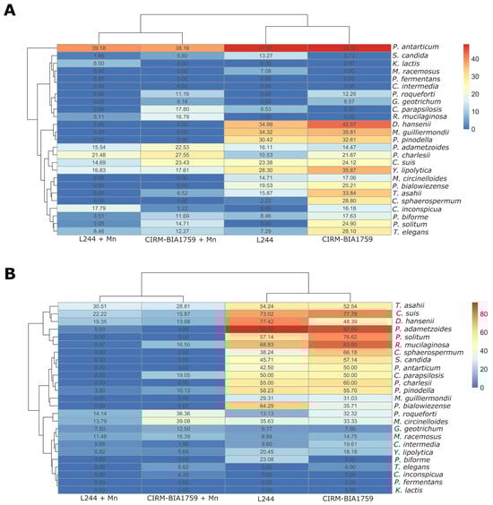 Heatmap representing growth parameters (percentages of (A) increase in lag time and (B) decrease in relative µmax) of the 25 fungal targets tested in whey produced with L. plantarum L244 or L. rhamnosus CIRM-BIA1759 and supplemented or not supplemented with Mn at 2.9 µg/g (three replicates/condition).
