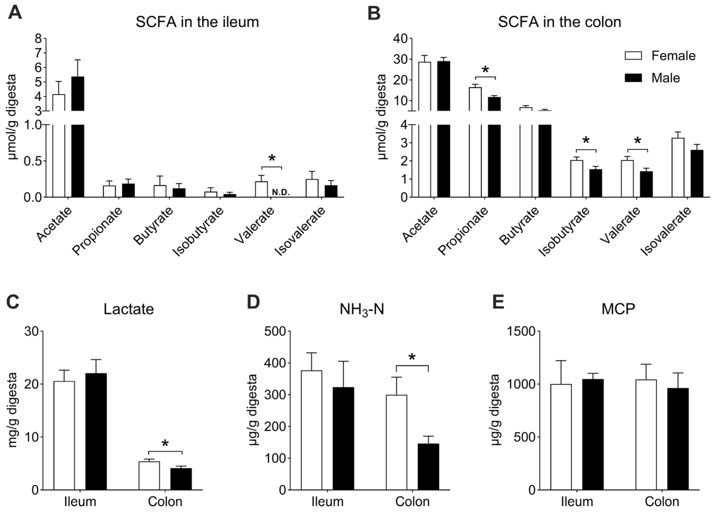 3.4. The Effect of Sex on the Microbial Metabolites in the Ileal and Colonic Digesta