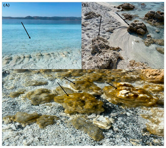 Sampling locations of Lake Salda (A) water, (B) stromatolites, (C) biofilm samples.