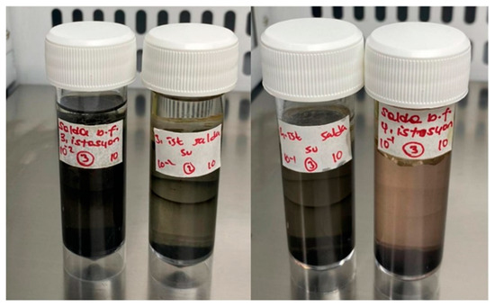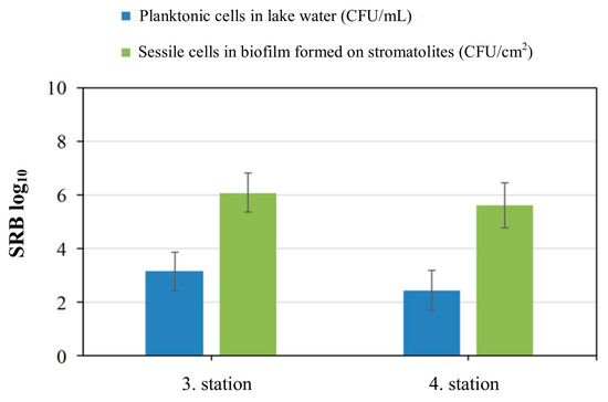 SRB were isolated from biofilm samples formed on the stromatolite’s surfaces and in the Lake Salda water. All samples were inoculated into the SRB enrichment culture. After the incubation time, the tubes turned black in color, and the best growth was observed from the third and fourth stations (Figure 5). The total bacteria cell counts are given in Figure 6. The total cell count in the lake water samples obtained from the third station was found to be 5180 cfu/mL, while at the fourth station, it was 3877 cfu/mL. The total cell count in the biofilm samples was found to be 4.8 × 105 cfu/cm2 in the third station and 4.4 × 105 cfu/cm2 in the fourth station. Also, it was found that the total cell count in the biofilm was significantly higher than in the water (p < 0.05), and a significant positive correlation was detected between the bacterial counts (r = 0.846, p < 0.01). The experiment was repeated twice for reproducibility.
