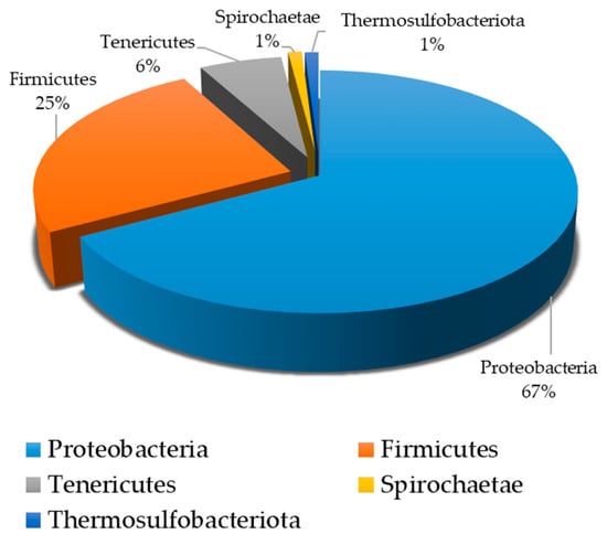 The presence of SRB in Lake Salda’s water was also confirmed using a molecular approach. The NGS analysis results showed that the SRB coexisted with other bacteria in the water samples taken from Lake Salda (Table 3). The dominant phyla in this study included Proteobacteria (67%), Firmicutes (25%), Tenericutes (˂6%), Spirochaetae (˂1%), and Thermosulfobacteriota (˂1%) (Figure 7). In Lake Salda’s water, the first time, Desulfofustis limnaeus, a novel member of the Thermosulfobacteriota was identified. The alpha diversity, counted as number of species, was 60. The number of raw reads, reads left after post quality filtering, and number and proportion of reads used in final classification are given in Table 4.