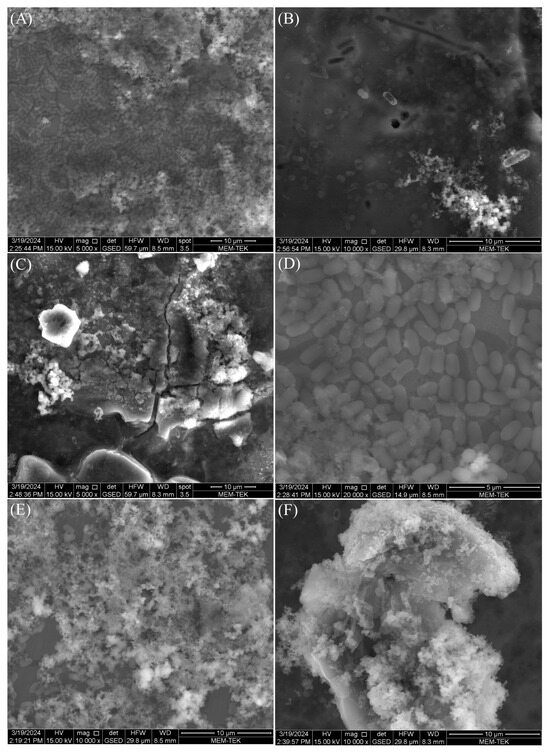 SEM images of SRB biofilm (A–E) and corrosion product (F) on AA7075 coupons after the 30-day incubation.