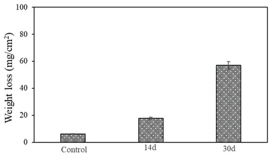 The weight loss data of the AA7075 alloy are shown in Figure 11. Each weight loss data point represents the average from the replicate coupons. The weight loss for the control coupon was the lowest (6.1 ± 0.1 mg/cm2) after the 30-day incubation. The weight losses (mg/cm2) were 17.8 ± 0.25, 57.0 ± 0.20 and the corrosion rates were calculated as 1.71 mm/y and 2.56 mm/y for after 14-day and 30-day incubation, respectively. Note that the removal of the corrosion products on reactive metals such as Al is quite difficult because of the oxide layer tightly bonded to the surface.