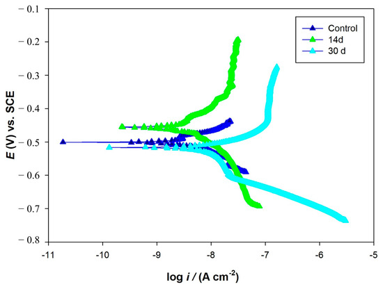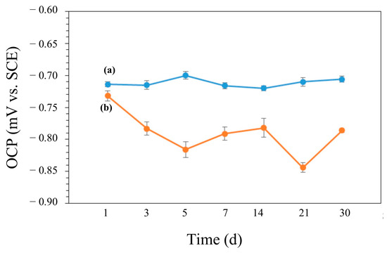 The variations in OCP vs. time during the 30-day incubation in the media with and without bacteria are shown in Figure 12. The OCP value of the coupon was around −0.714 V in the abiotic medium and it did not show significant changes during the experiment (Figure 12a). In the biotic medium, the OCP value of the coupon shifted into the negative during the 30 days of incubation (Figure 12b). More negative values in Eocp were also observed for the biotic coupons, also indicating increased tendencies for electron loss by AA7075. PDP scans are shown in Figure 13. The electrochemical parameters (Ecorr, Icorr, βα, βc) are given in Table 5. The control coupon showed lower corrosion current density (Icorr) compared to the biotic coupons. The Icorr values of the AA7075 coupons were found to be 9.2 and 76.7 nA/cm2 after 14 and 30 days of incubation, respectively. For PDP data see the Supplementary Table S1.