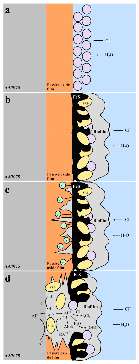 Generalized illustration of the corrosion mechanism for the 7075 aluminum (a) in sterile solution, (b–d) in SRB-enriched media.