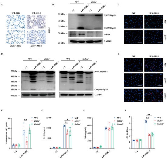To dissect the IFI204-driven host defense signaling mechanisms, the positive expression location of IFI204 was detected in lung sections. Immunohistochemical (IHC) staining revealed that elevated expression of IFI204 was observed in the infiltrated inflammatory cells of the infected tissues (Figure 3A). Correspondingly, the IFI204 protein level was also prominently up-regulated by the pathogenic M. haemolytica challenge in bone marrow-derived macrophages (BMDMs) (Figure 3B,C and Figure S2). Subsequently, we asked if Ifi204 deficiency impairs inflammasome signaling in macrophages. Consistent with the in vivo findings, inflammasome signaling was significantly attenuated in Ifi204−/− BMDMs vs. in WT BMDMs, as shown by the weakened Caspase-1 cleavage, impaired ASC speckles formation, reduced LDH activity, and mature IL-1β secretion (Figure 3D–G,I and Figure S3), while TNF-α secretion was not significantly affected (Figure 3H), suggesting that Ifi204 deficiency leads to a defect in inflammasome signaling activation in response to pathogenic M. haemolytica infection. Especially, gasdermin D (GSDMD), a critical executor of inflammasome activation, was also evidently suppressed in Ifi204−/− BMDMs (Figure 3B). Importantly, IL-1β release and LDH activity were remarkably inhibited in Gsdmd−/− BMDMs following pathogenic M. haemolytica challenge (Figure 3G,I), despite Caspase-1 activation, ASC speckles formation and TNF-α production being little affected (Figure 3D–F,H). These results demonstrated that IFI204 activates inflammasome signaling in a GSDMD-dependent manner.