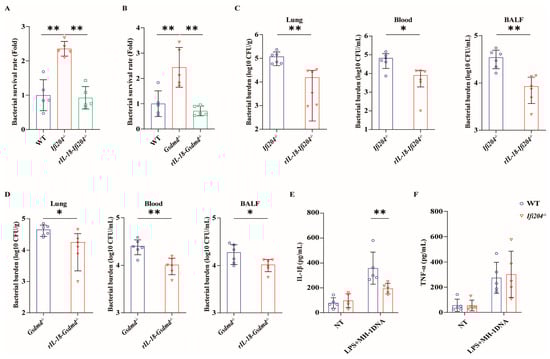 Inflammasome signaling downstream of IFI204 restricts bacterial invasion. LPS-pretreated WT, Ifi204−/−, and Gsdmd−/− BMDMs were primed with rIL-18 (1 ng/mL, 1 h) or PBS before being stimulated with M. haemolytica (MOI = 20, 6 h). (A,B) The bacterial survival was assessed (p = 0.0003, p < 0.0001). Age- and sex-matched Ifi204−/− and Gsdmd−/− mice were intraperitoneally injected with rIL-18 (1 μg/mouse) or PBS prior to being intranasally challenged with 5 × 109 CFU log-phase pathogenic M. haemolytica strain MH-1 for 24 h (p = 0.0089, p = 0.0014). (C,D) Bacterial loads in the lungs (p = 0.0053, p = 0.0181), blood (p = 0.0413, p = 0.0031), and BALF (p = 0.0019, p = 0.042) were determined. (E,F) LPS-pretreated WT and Ifi204−/− BMDMs were exposed to M. haemolytica-derived genomic DNA (50 µg/mL, 8 h). IL-1β (p = 0.0072) and TNF-α (p = 0.9167) secretion in the BMDMs supernatants were indicated via ELISA. Graphs are means ± standard deviation (SD) from data pooled from five (A,B,E,F) and six (C,D) biological replicates. Statistical significance is considered as * p < 0.05, ** p < 0.01.