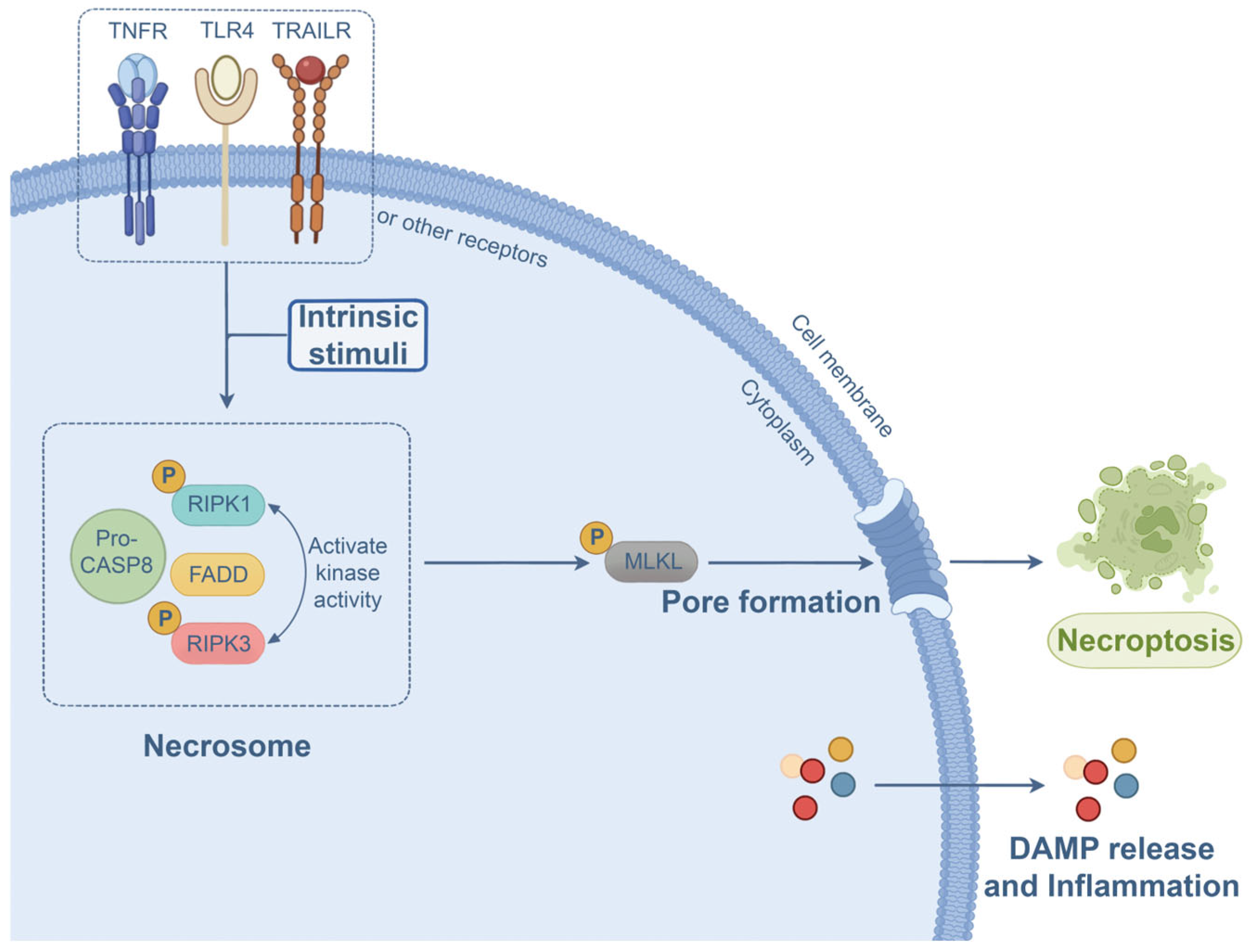 | AZD5423 | RIPK3 Binds to the kinase domain of RIPK3 and decreases its activation | RIPK3-mediated cell injury and acute kidney injury | Restores cell viability and attenuates kidney injury and inflammation | [154] |