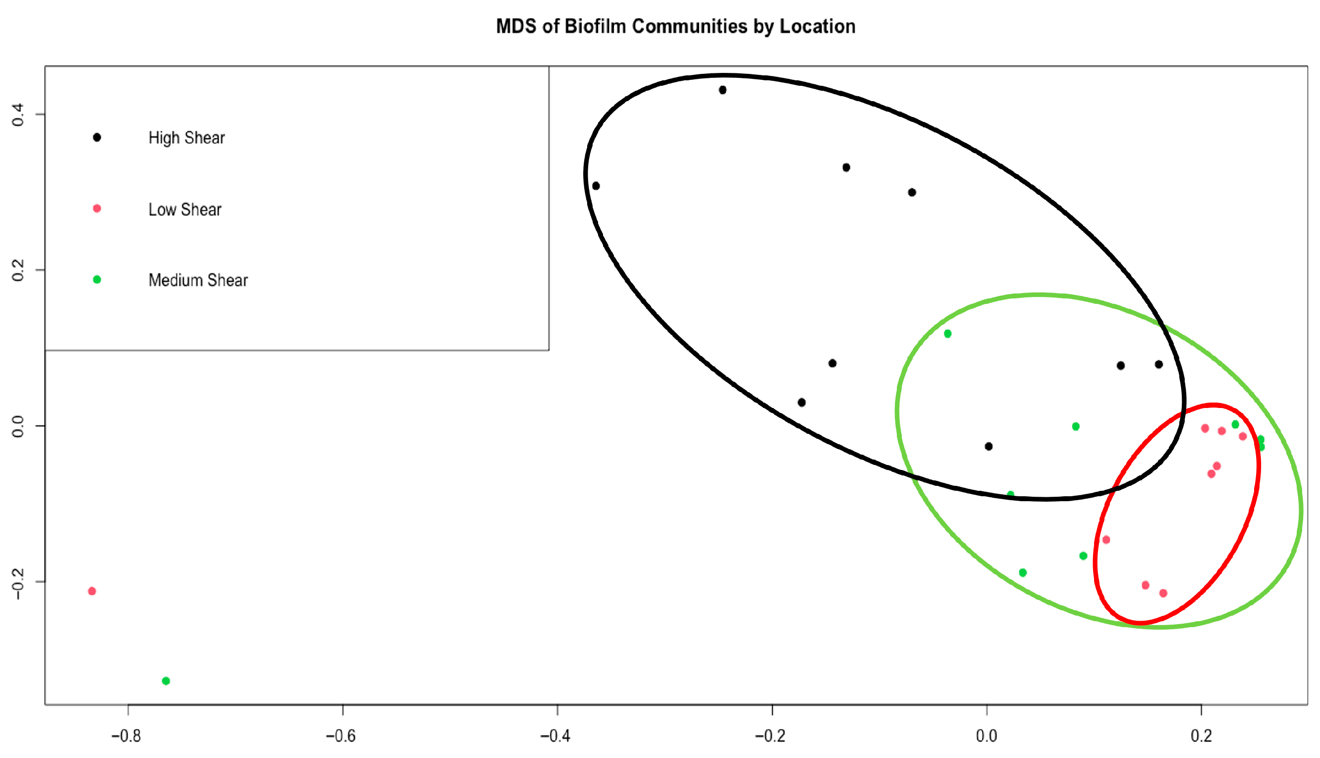 | Exposure Duration | Location | Shear Stress | Average Density | Average Biofilm Thickness (mm) |