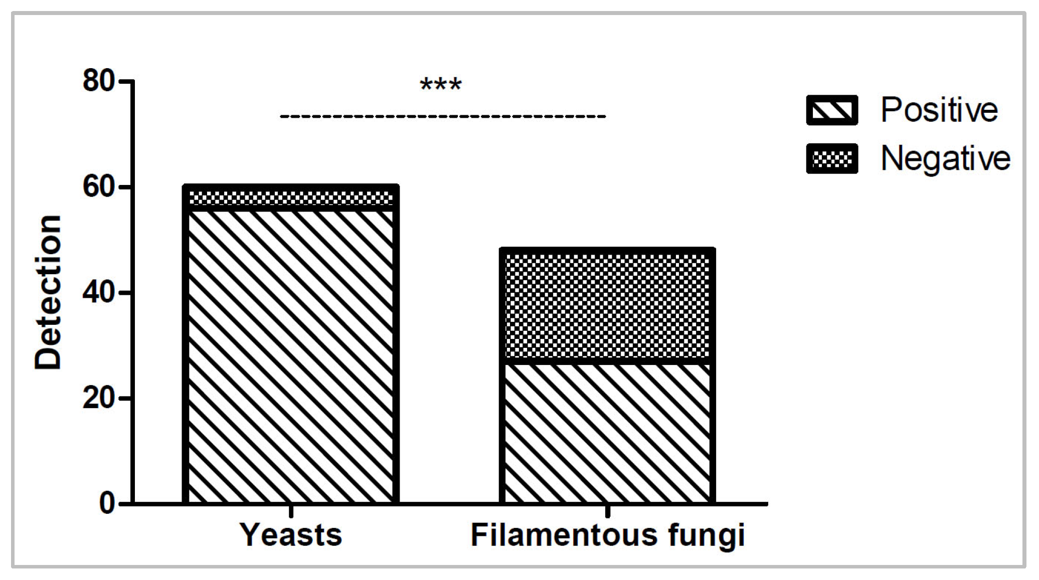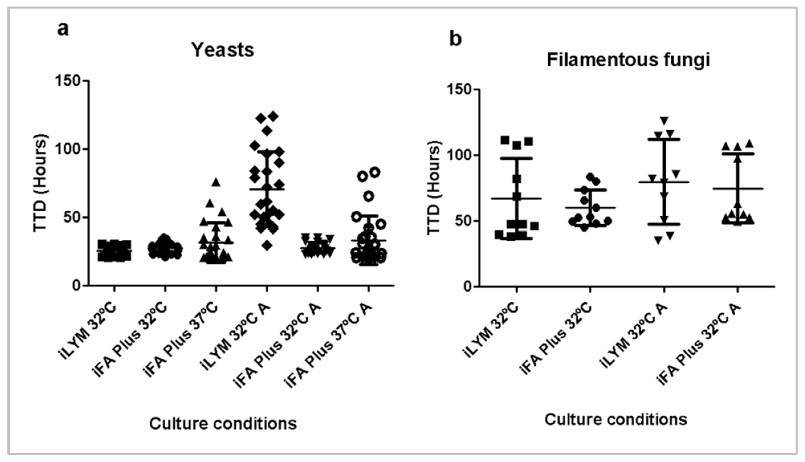 - Breathnach, A.; Evans, J. Growth and detection of filamentous fungi in the BacT/Alert blood culture system. J. Clin. Pathol. 1995, 48, 670–672. [Google Scholar] [CrossRef]