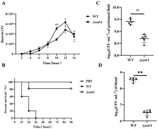 As shown in Figure 1A, ΔsodA exhibited slower growth than the WT stains with p < 0.01 at hour 10 post-inoculation. The impact of sodA deletion on virulence was assessed in BALB/c mice. All mice inoculated with WT strains showed signs such as ruffled hair coat and slow response to stimuli and died within the first 36 h. However, most of the mice inoculated with ΔsodA did not show clinical symptoms and stayed alive, with only two deaths during the first 24 h (Figure 1B). For further study, the bacterial loads of WT and ΔsodA in PLF and blood samples collected from mice at 24 h after intraperitoneal injection were investigated. The ΔsodA loads were higher than those for WT both in blood and PLF, with p < 0.01 (Figure 1C,D). These results confirmed that deletion of the sodA gene significantly impaired the virulence of SS2 in mice. And the decreased pathogenicity of sodA may result from the lower bacterial loads in mice.