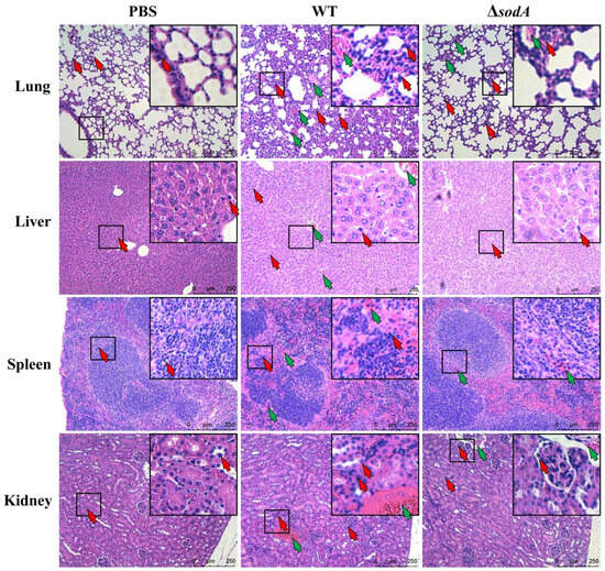 Histological detection of tissue in mice injected with WT and ΔsodA. Tissue samples were collected from mice at 24 h after intraperitoneal injection (n = 3); HE staining was used to estimate tissue damage of lung, liver, spleen, and kidney tissue. Green arrows, hemorrhage; red arrows, macrophage; scale bar = 250 μm.