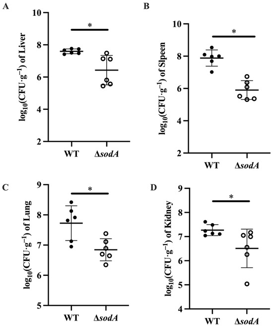 Tissue damage always results from bacterial colonization [18]; this study therefore explored the bacterial loads in tissues collected from mice injected with WT and ΔsodA. As shown in Figure 3, more WT colonized in liver, lung, spleen, and kidney tissues of mice than ΔsodA (p < 0.05). These findings suggested that deletion of the sodA gene decreased the bacterial loads of SS2 in mice.
