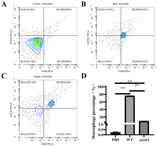 Macrophage population in PLF collected from mice challenged with SS2 and ΔsodA. Macrophages were assessed by CD11b+F4/80+ and analyzed by flow cytometry. A color scale bar was added to show the cells’ density (blue, green, and red represent low cell density, medium cell density, and high cell density, respectively). (A–C) PLF samples collected from mice 24 h after intraperitoneal injection with PBS, WT, and ΔsodA, respectively. (D) The cell numbers in the upper right quadrant (F4/80-positive/CD11b-positive, macrophages) were counted and shown. n = 3, ** p < 0.01; one-way ANOVA with Tukey’s post hoc test was used; data are shown as mean ± SD.