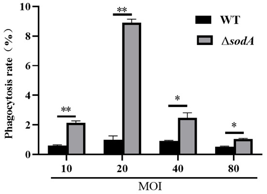 In mice, macrophages are involved in defense against SS2, and our previous results evidenced that absence of the sodA gene impaired the recruitment of macrophages. The present study further examined the effect of sodA gene deletion on phagocytosis in a macrophage cell line J774A.1. As shown in Figure 5, the ΔsodA mutant was more readily phagocytosed than WT in 1 h at MOI = 10, 20, 40, 80 (p < 0.05) in macrophages. These data suggest that the sodA gene was involved in SS2 against phagocytosis of macrophages.