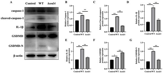 Effect of sodA gene deletion on caspase-1/GSDMD pathway activation in macrophages induced by SS2. (A) Immunoblotting bands of β-actin, GSDMD, GSDMD-N, caspase-1, cleaved-caspase-1, IL-1β, and IL-18; (B–G) relative expression of the proteins to β-actin. Macrophages were incubated with WT or ΔsodA for 8 h (MOI = 20, n = 3). * p < 0.05, ** p < 0.01; one-way ANOVA with Tukey’s post hoc test was used; data are shown as mean ± SD.