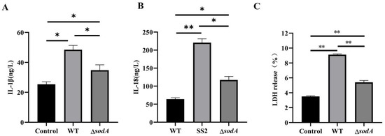 Effect of sodA gene deletion on inflammatory cytokine release in macrophages induced with SS2. (A–C) The contents of IL-1β, IL-18 and LDH in the supernatant. Macrophages were incubated with WT or ΔsodA for 8 h (MOI = 20, n = 3). * p < 0.05, ** p < 0.01; one-way ANOVA with Tukey’s post hoc test was used; data are shown as mean ± SD.