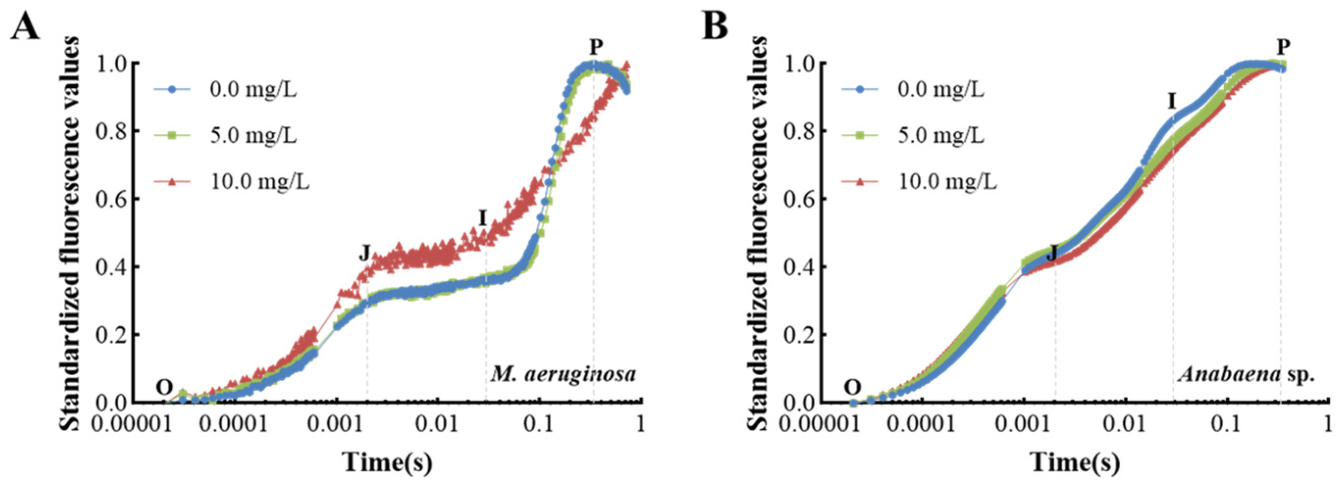 Figure 5. Effect of prodigiosin on the fast induction curves of chlorophyll fluorescence (O J-I-P curve) of M. aeruginosa (A) and Anabaena sp. (B). Values represent the mean of three independent measurements (n = 3). All processes were biologically repeated in three independent and parallel experiments.