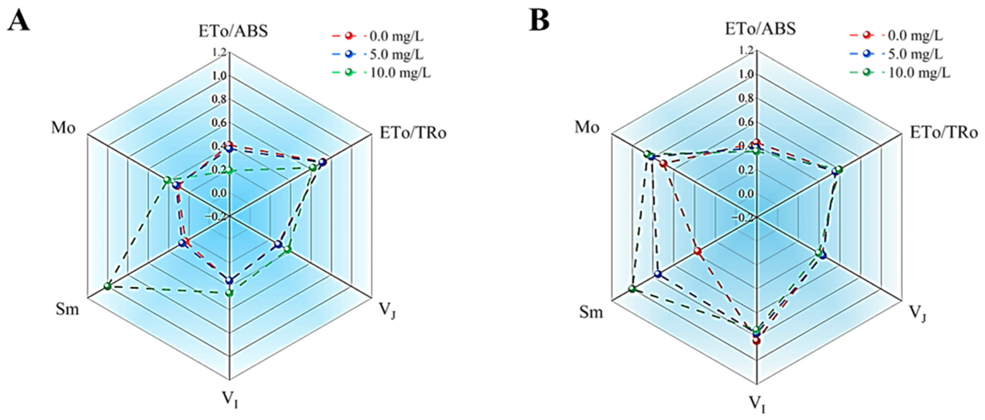 Figure 5 presents the temporal analysis of OJIP curves under varying concentrations of prodigiosin. As depicted in Figure 5A, the OJIP curves for M. aeruginosa exhibited no significant alterations following a 24 h exposure to low concentrations of prodigiosin. Conversely, as prodigiosin concentrations increased, there was a notable upward trend in the J-phase and I-phase levels of the OJIP curve. This trend suggests a reduction in the efficiency of electron transfer from QA to QB within the photosynthetic electron transport chain, resulting in the excessive accumulation of QA within the cells and subsequent cellular damage. In contrast, the OJIP curves for Anabaena sp. exposed to varying concentrations of prodigiosin retained a typical distribution without significant differences (Figure 5B), corroborating the heightened sensitivity of M. aeruginosa to environmental prodigiosin exposure.