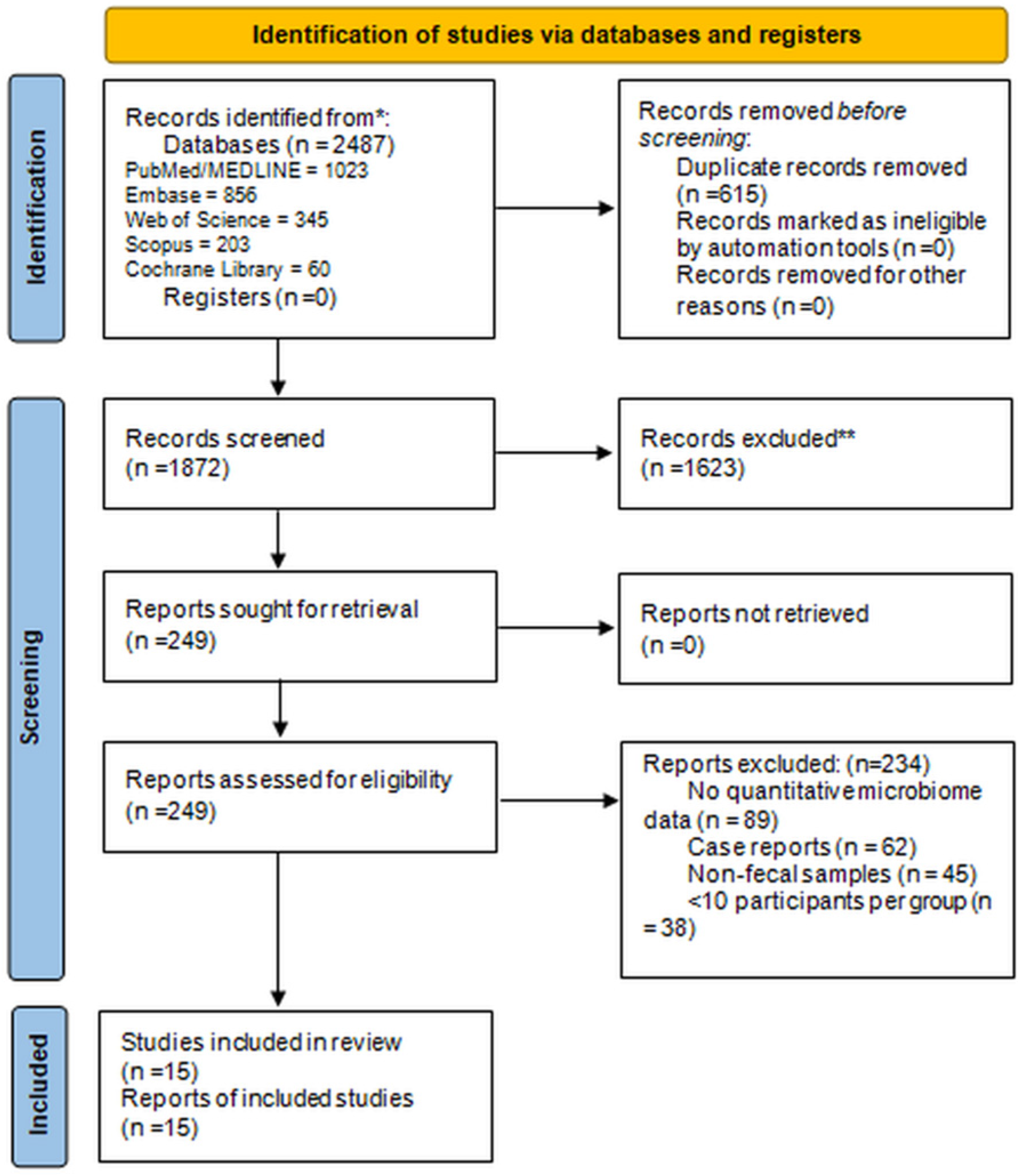| Narrative (excluded) | Fabbrini et al. [25] | 52/35 | −0.12 | NS | p = 0.78 | Depletion of beneficial producers; excluded due to incompatible outcome definitions or insufficient summary statistics for effect size/SE derivation. |