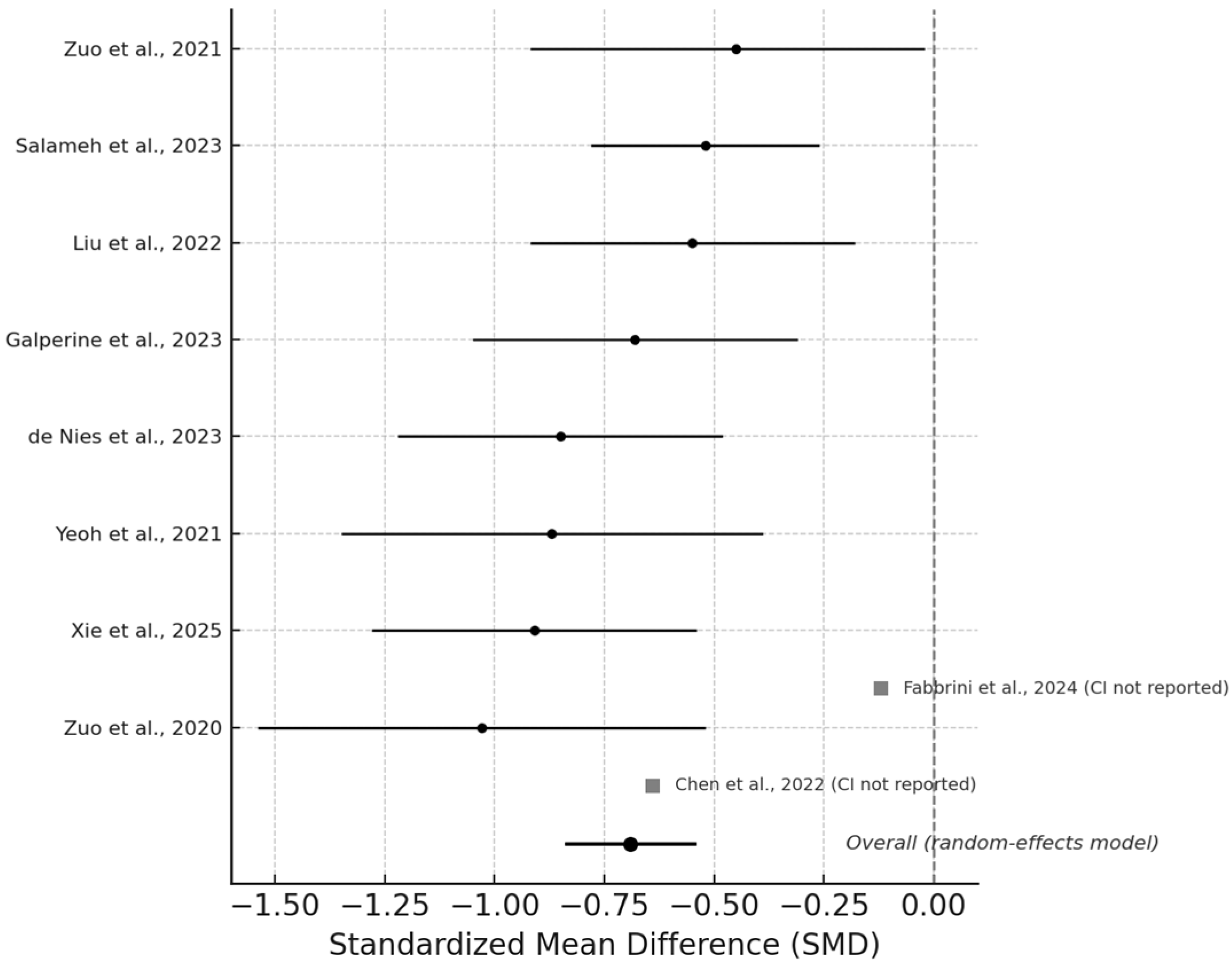 | Pooled (k = 11) | n = 1096 | −0.69 | [−0.84, −0.54] | p < 0.001 | Random-effects; I2 = 42%; τ2 = 0.03 (Newsome et al. [24] excluded from pooling: SMD −1.20, p < 0.05; narrative synthesis; Cui et al. [23] excluded due to cross-sectional design and metabolomics focus: SMD −0.52, p < 0.05; narrative synthesis; Chen et al. [19] and Fabbrini et al. [25] excluded due to incompatible outcome definitions or insufficient summary statistics for effect size/SE derivation) | |