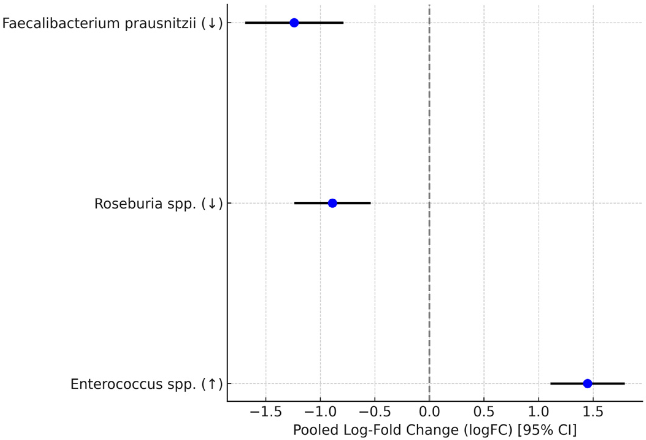 | 10 | Xie et al. [26] | Faecalibacterium prausnitzii ↓; Anaerococcus ↑ | −1.10 (Faecalibacterium prausnitzii) | p < 0.001 | ↓ | Reduced SCFA-producers at 2-year follow-up. |