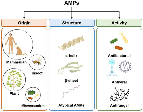 AMPs, which are host defense peptides, are short proteins comprising fewer than 100 amino acid residues and that exist in most organisms, such as insects, plants, and animals [23]. They serve important immune roles with defense against bacteria, fungi, and viruses that threaten the host. As AMPs are expressed ubiquitously in various organisms, they comprise numerous types and can be classified according to various criteria, including their origins, structures, and activity (Figure 1) [24,25].