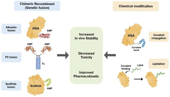AMP bioengineering methods to overcome therapeutic limitations. Two primary bioengineering strategies have been developed to enhance the therapeutic properties of AMPs. Chimeric recombinant utilizes genetic fusion to link AMPs with stable scaffolds, including HSA, the Fc region of IgG, and other proteins or peptides. In contrast, chemical modification involves the post-synthetic alteration of AMPs, such as the covalent conjugation of the AMPs to HSA or lipidation, in which fatty acid chains are covalently attached to AMPs. Both strategies aim to achieve common therapeutic improvements for AMPs, specifically increased in vivo stability, decreased toxicity, and improved pharmacokinetics.