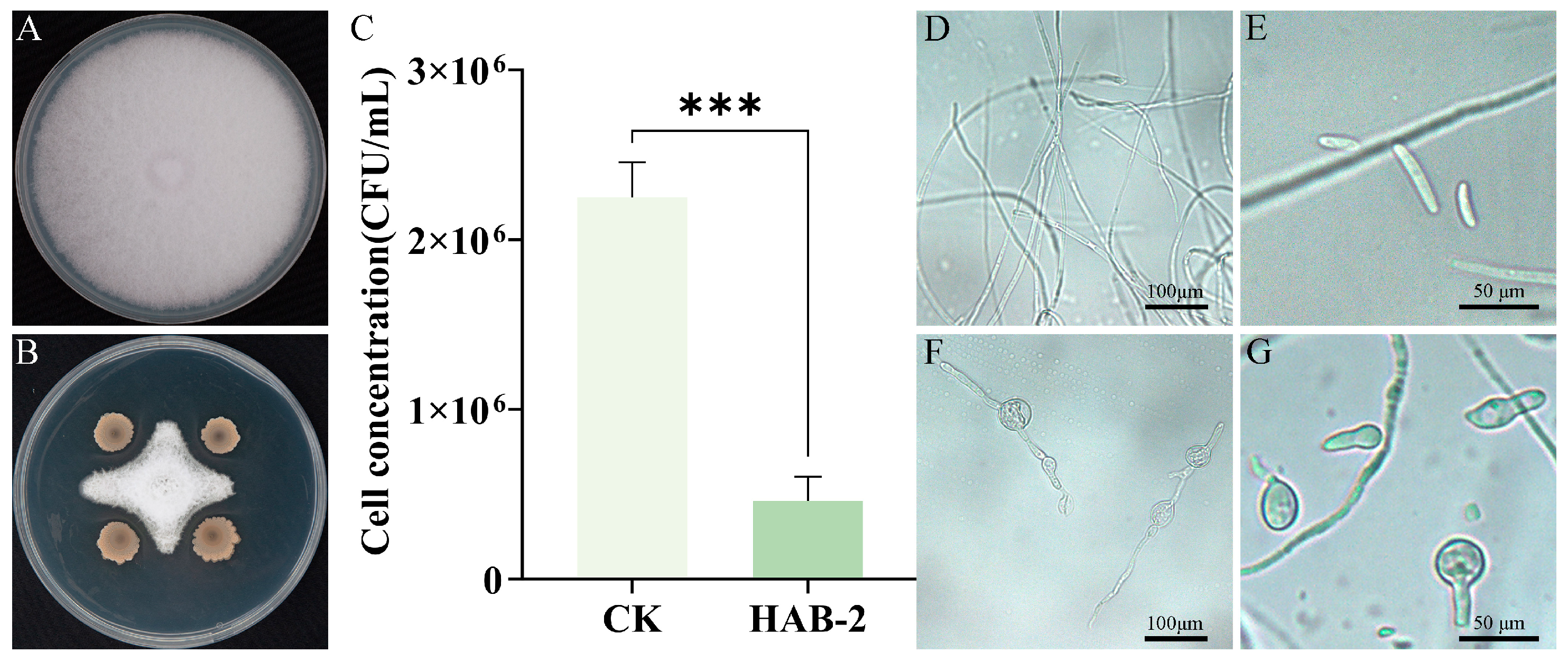 Figure 2. Antifungal effects of B. velezensis HAB-2 against Fot. (A) F. oxysporum f. sp. tracheiphilum AIQBFO93 growth in control; (B) Suppressed mycelial growth following HAB-2 treatment; (C) Significant reduction in spore production after HAB-2 treatment; (D) Normal mycelial morphology of F. oxysporum f. sp. tracheiphilum AIQBFO93; (E) Abnormal mycelial morphology of F. oxysporum f. sp. tracheiphilum AIQBFO93 induced by HAB-2; (F) Normal spores of F. oxysporum f. sp. tracheiphilum AIQBFO93; (G) Deformed spores following HAB-2 treatment.“***” indicates a statistically significant difference at p < 0.001 based on ANOVA.