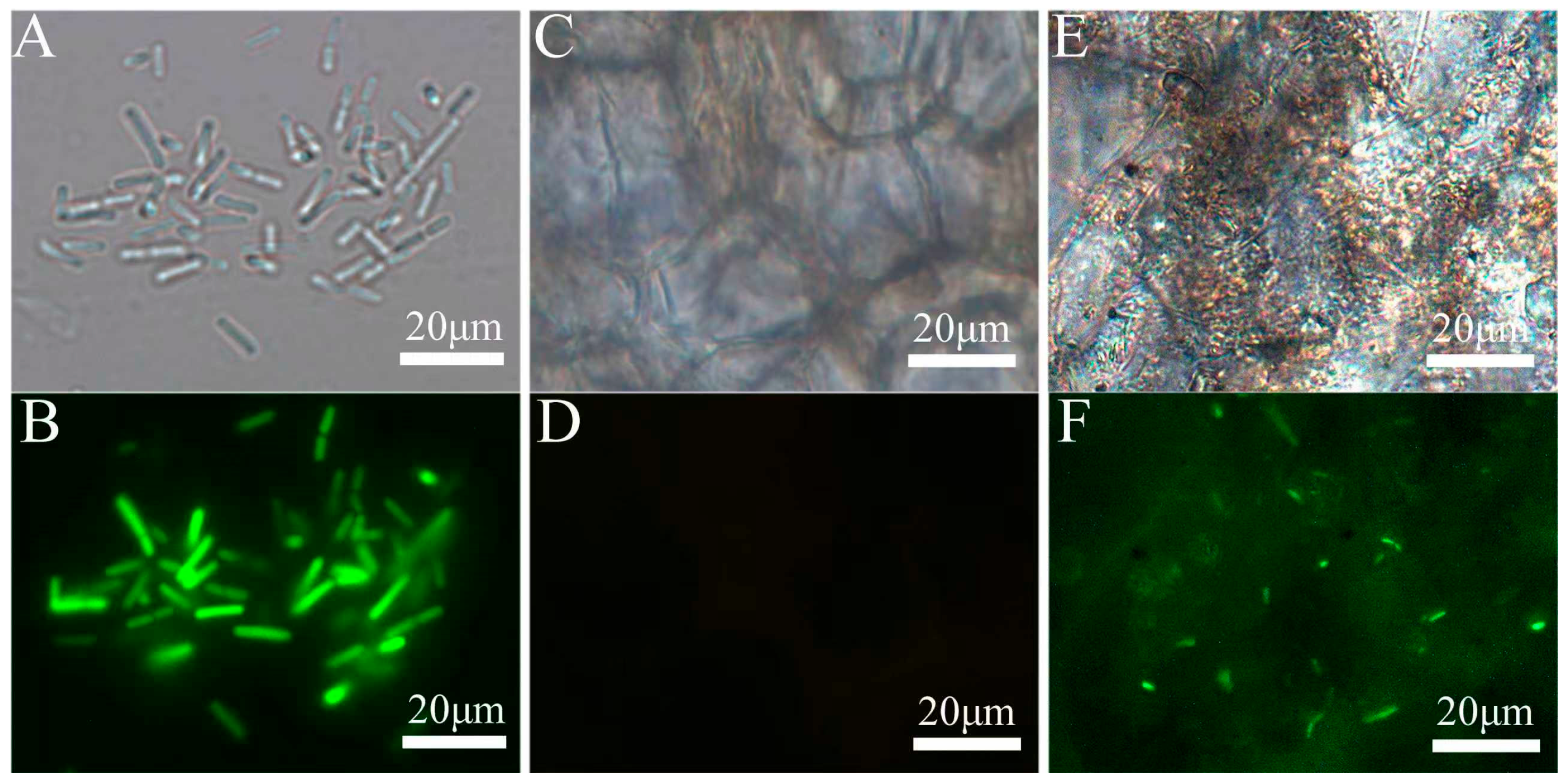 Figure 3. Colonization of cowpea roots by HAB-2-gfp. (A,B) HAB-2-gfp strain; (C,D) Cowpea root epidermis untreated with HAB-2-; (E,F) Cowpea root epidermis treated with HAB-2-gfp; (A,C,E) Bright-field images; (B,D,F) Dark-field fluorescence images.