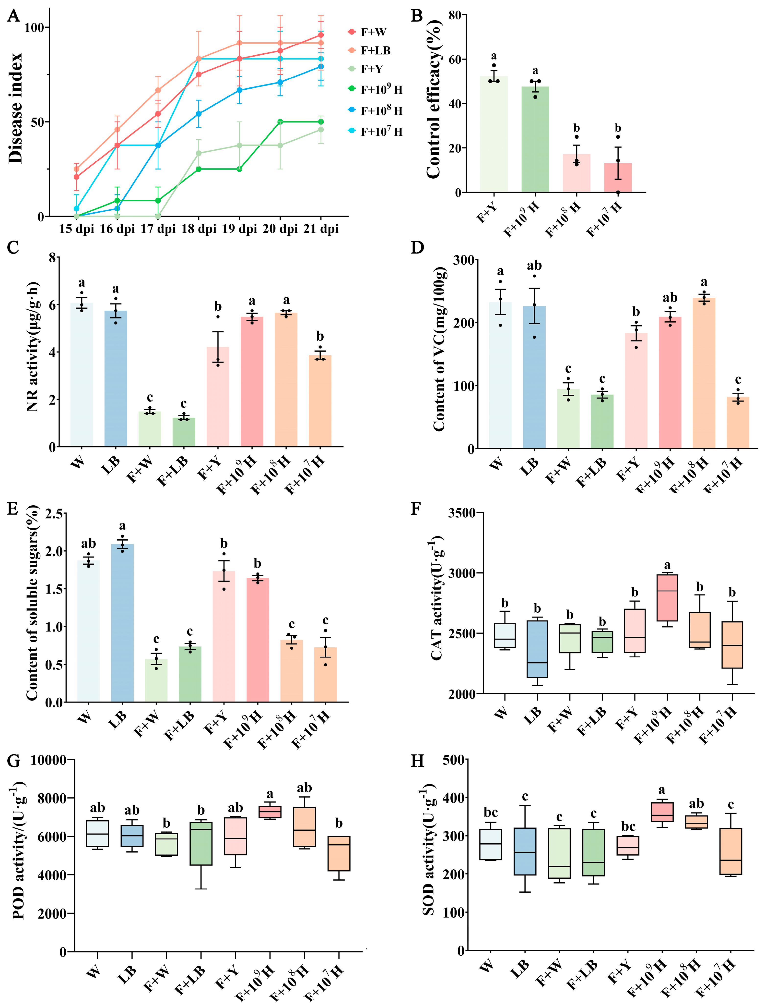 Figure 4. Biocontrol efficacy of HAB-2 in pot experiments and changes in defense-related enzyme activities in cowpea leaves. (A) Disease severity index; (B) Control efficacy; (C) Nitrate reductase activity; (D) VC content; (E) Soluble sugar content; (F) Catalase (CAT) activity; (G) Peroxidase (POD) activity; (H) Superoxide dismutase (SOD) activity. Each treatment was performed in triplicate. Data are presented as mean ± standard error (SE). Different letters indicate statistically significant differences among treatments at p < 0.05 based on ANOVA. (A,B) Each treatment was repeated three times, and each replicate contained three cowpea seedlings. (C,D,E) Each treatment was conducted with three replicates. (F,G,H) Each treatment included five replicates.